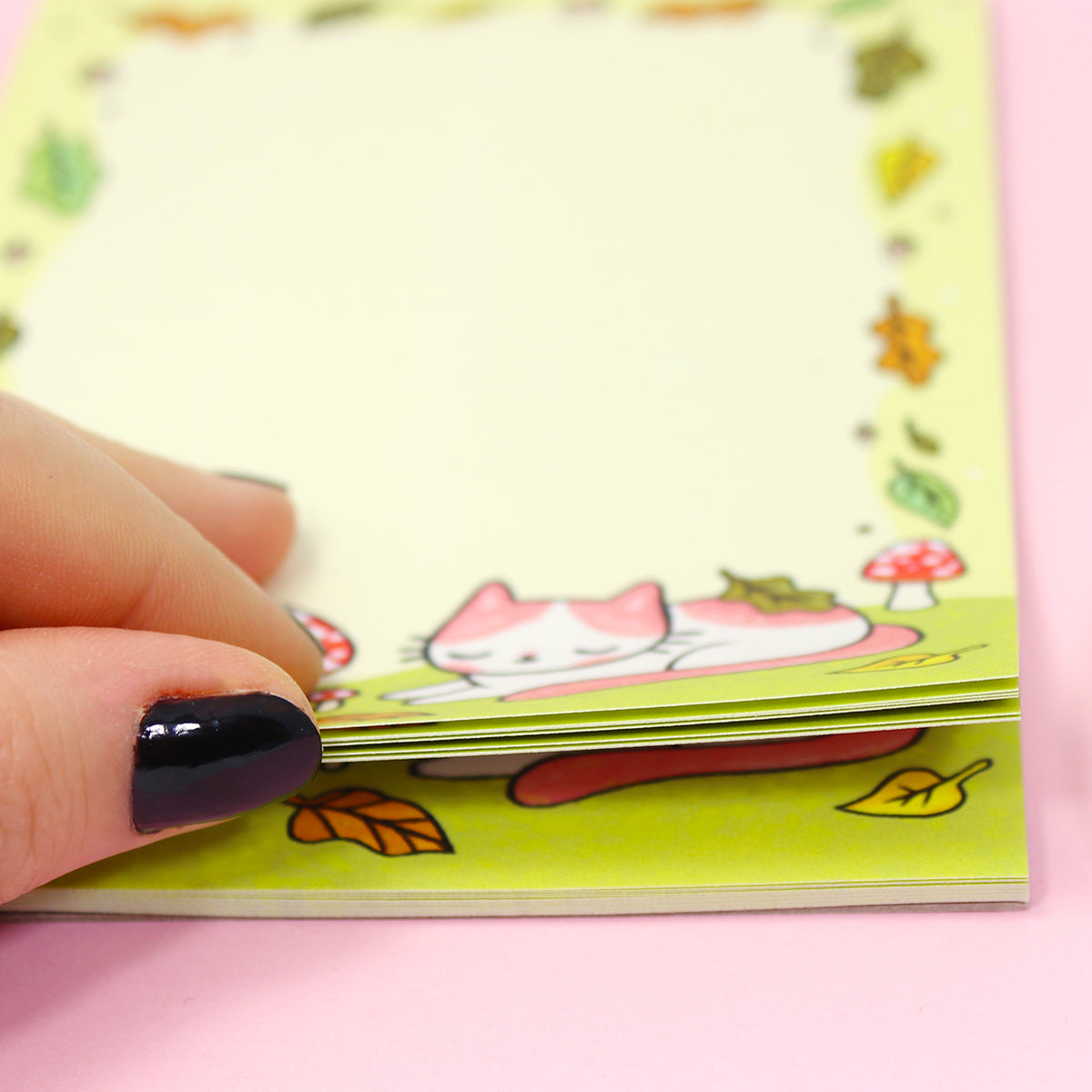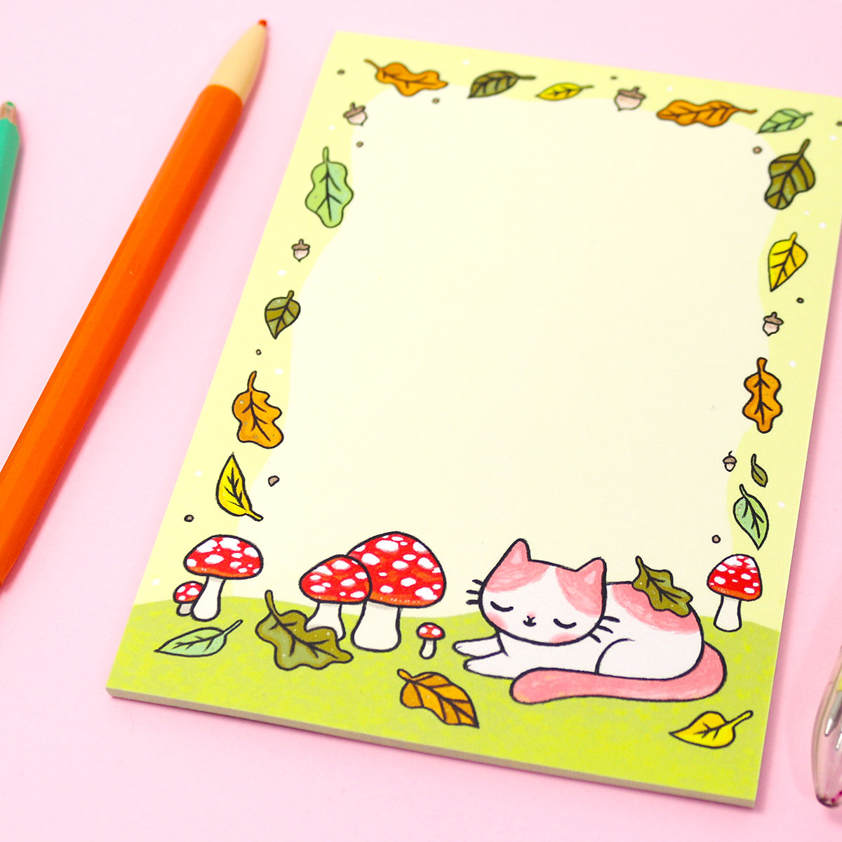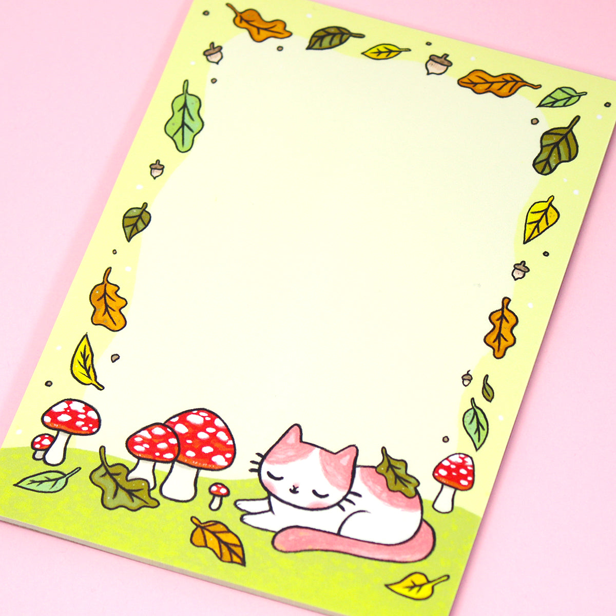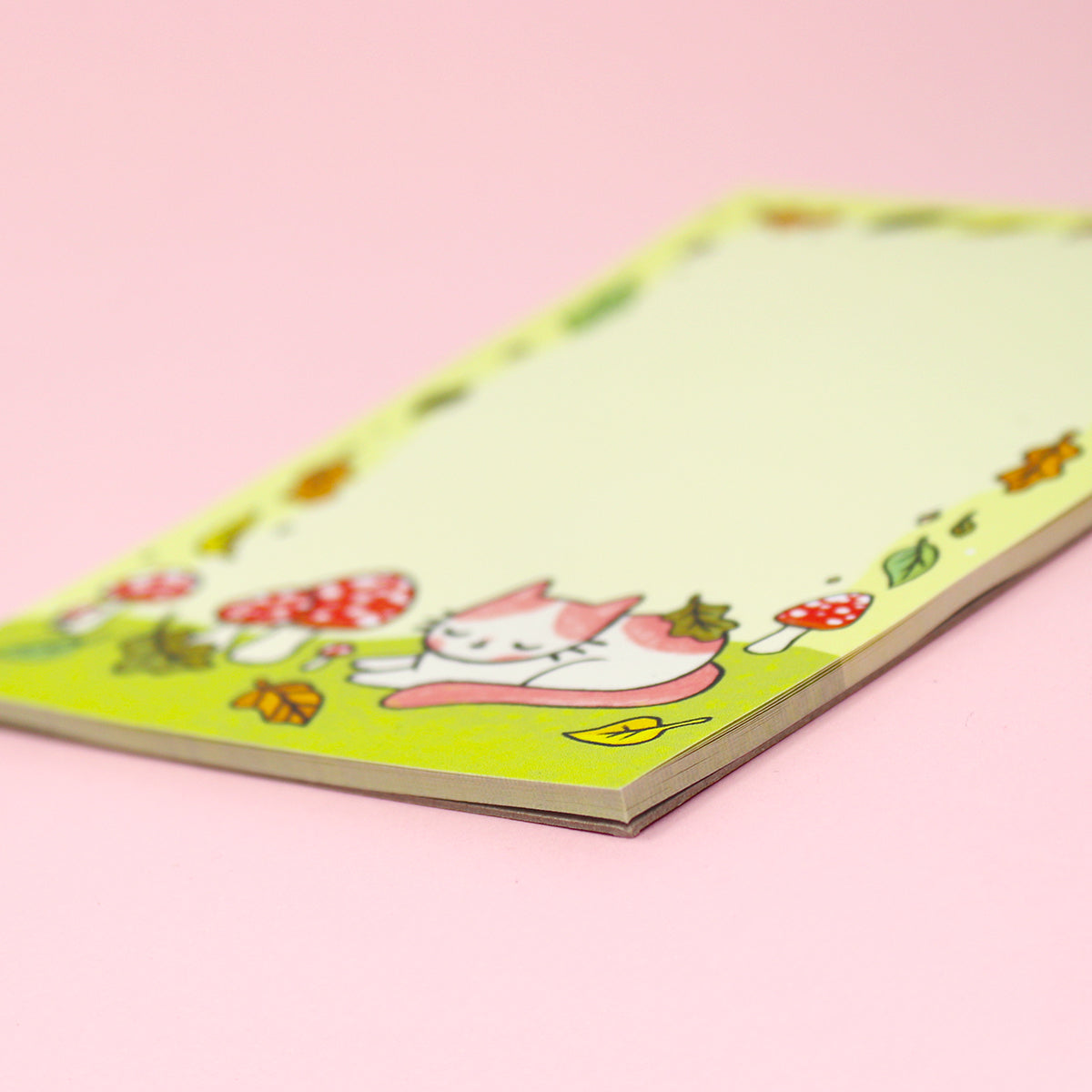 Mushroom cat notepad professionally printed on 25 pages of 90 g/m² A6 paper.